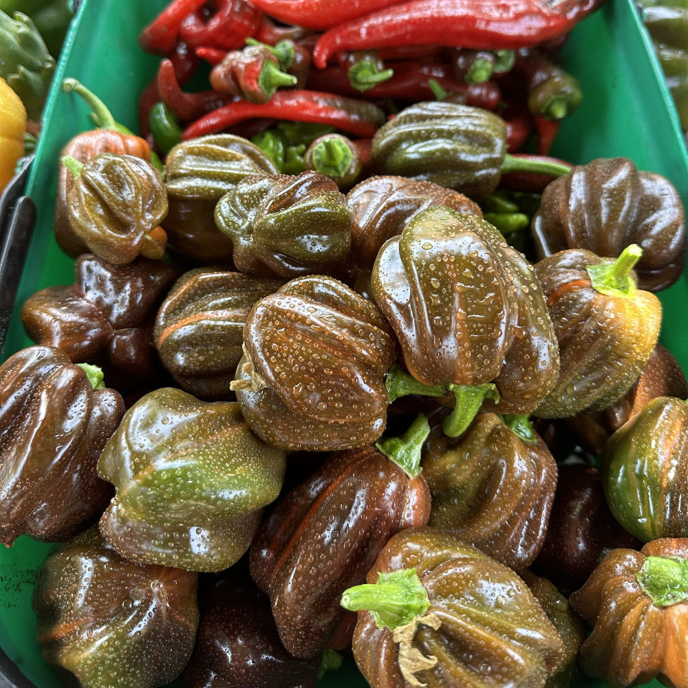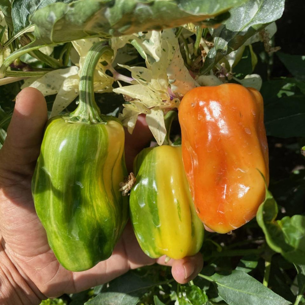 A standout in both the garden and kitchen, this variety produces mini bell peppers that begin green with creamy striping and mature into deep chocolate red with beautiful variation in between. The plants feature green and white variegated leaves that stay compact and productive, yielding sweet, crisp fruits that make a great snacking pepper and add color to salads and summer dishes. Reliable and steady all season, it’s a unique addition to any warm-weather garden.
